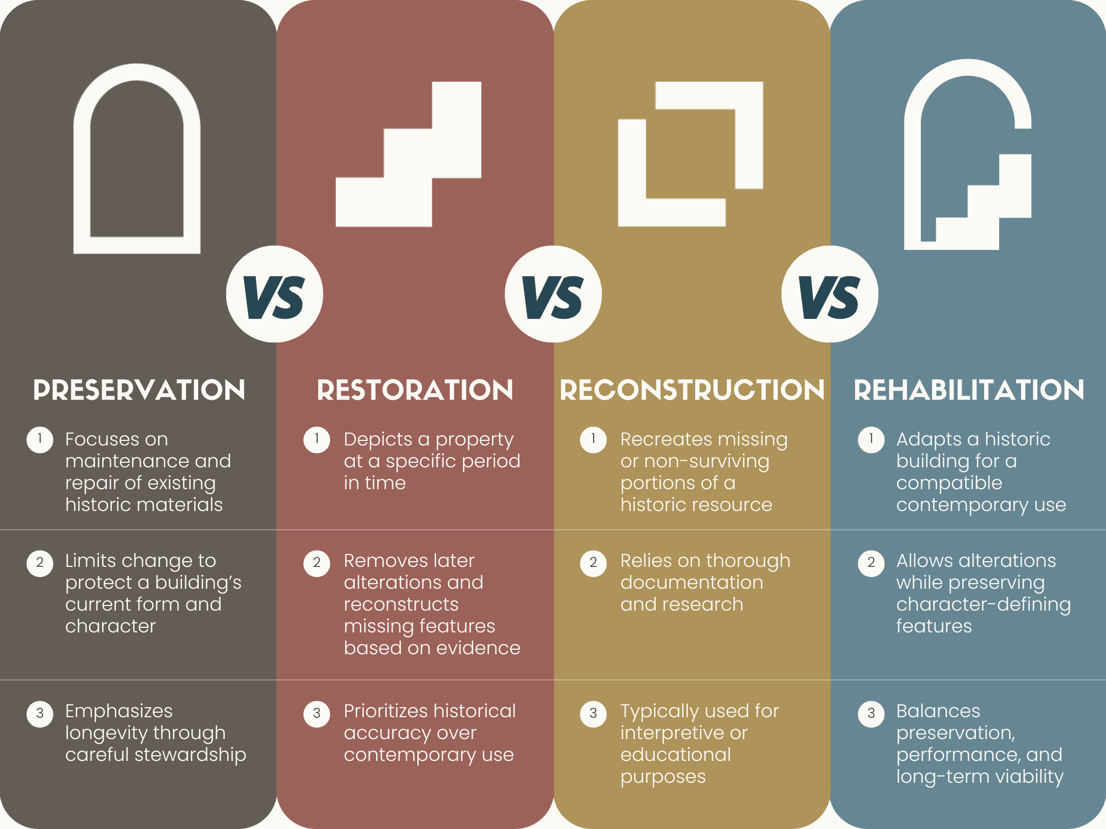 One reason preservation gets misunderstood is because people use terms like “preservation” and “restoration” as a catch-all for distinct approaches. The National Park Service recognizes four treatment approaches, each with a different intent. (National Park Service)